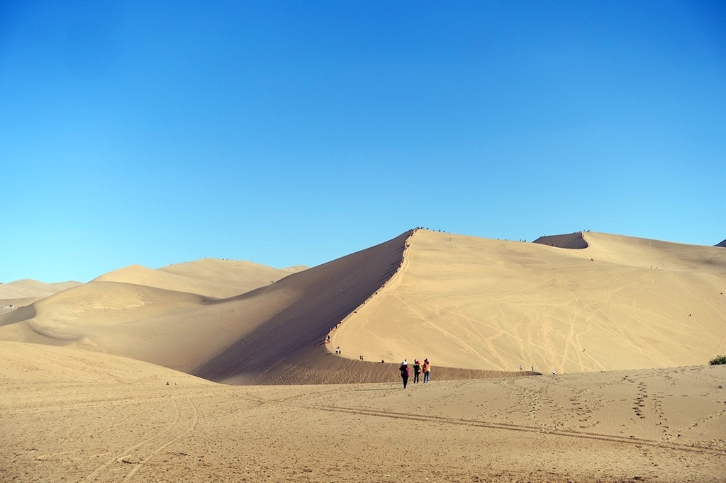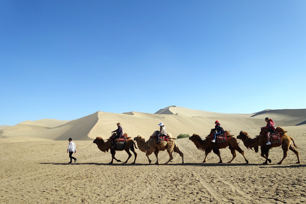 駱駝最後會停在山頭上,集中,旅客會下駱駝,可以自由走走,參加飆沙活動,結束後前往月牙泉。