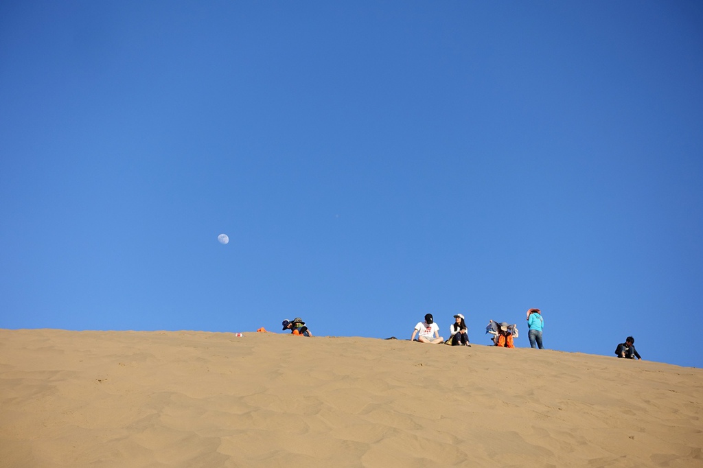 來到鳴沙山最好有三個小時的時間,可以慢慢的靜靜的坐在沙丘之上,感覺一下天地,感覺一下活著的感覺,忘掉生活中庸擾的紅塵俗事,好好享受這個美麗的時刻。