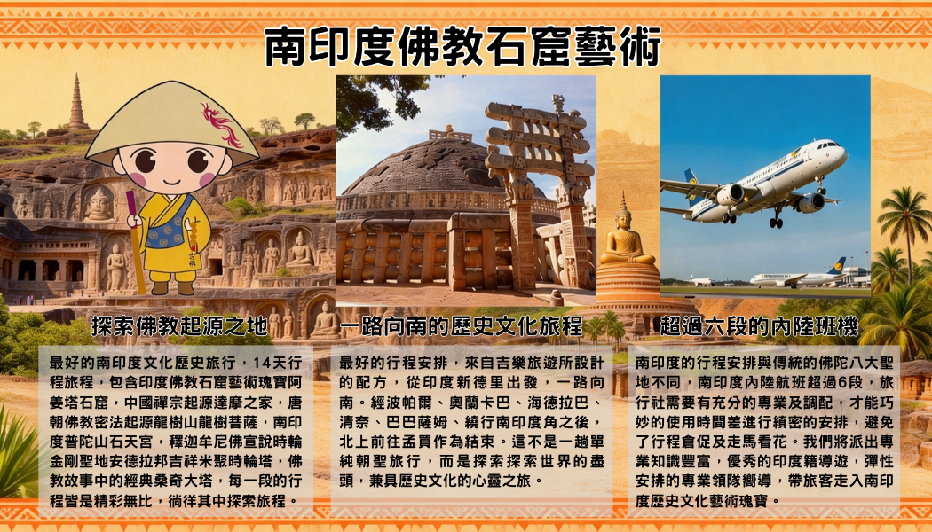 探訪南印度石窟佛教藝術瑰寶,採用多印度航段班機,嘴角上揚輕鬆自在