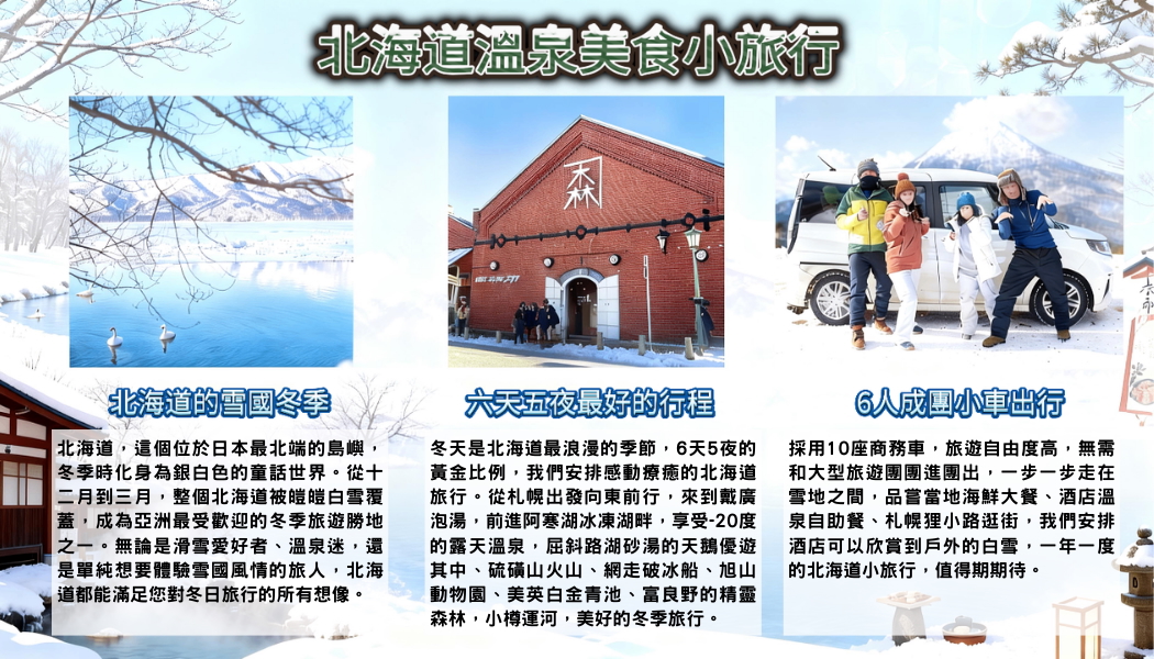 酒店早餐後, 前往【愛努村落】(Kotan)是日本北海道阿寒湖畔規模最大、最為著名的原住民聚落。 愛努村落展示並傳承愛努族與自然共存的文化、信仰與生活方式。 遊客可在此體驗愛努傳統舞蹈表演、參觀傳統家屋「Cise」、體驗木雕等工藝製作、愛努料理,並購買獨具特色的手工藝品,如木雕熊、刺繡等,深入了解這個獨特的日本原住民文化。 【阿寒湖】阿寒湖為四周被雌雄阿寒岳所環抱,周長約26公里的菱形湖。是由雄阿寒岳噴火所形成的火山口湖,以忠類島為首,浮現4個島嶼。也是以國家特別天然紀念物─綠球藻生長地而名,大而完整的球狀藻在世界上難得一見,彌足珍貴。【阿寒湖溫泉街~愛努村落】有許多商店~愛努料理、綠球藻、紀念品、愛努的樂器-MUKKURI、木雕民藝品等。其獨特傳統文化、茅草屋的設計、及成排掛在桿子上曬鮭魚的畫面,都令人回味不已。【阿寒湖湖上摩托車】阿寒湖在冬季提供的是雪上摩托車活動,而非夏季的水上摩托車活動。遊客可以在冬季體驗在阿寒湖結冰的湖面上騎乘雪上摩托車,並可選擇不同的路線長度,單人或雙人騎乘皆可。【阿寒遊久之里鶴雅】映入眼簾的是由長居阿寒湖畔的木雕師瀧口政滿先生精心雕製的兩隻日本丹頂鶴,日本丹頂鶴被當地的愛奴民族崇為濕原之神,同時也是鶴雅集團名稱的由來。「雅」字意謂著高雅,「鶴」字則意指日本丹頂鶴。集團初創的溫泉旅館阿寒遊久之里鶴雅,就如同這些高雅具象徵性的木雕一般,其魅力在於可在其中看到阿寒湖獨特的地理位置與文化和日本傳統美學的融合。住宿於本館,您可以品嚐到充分活用北海道新鮮豐富的當地食材烹製而成的美味佳餚。本館內部同時設有自助餐式的西式餐廳與傳統的日式懷石料理餐廳,提供多樣的晚餐供您選擇。