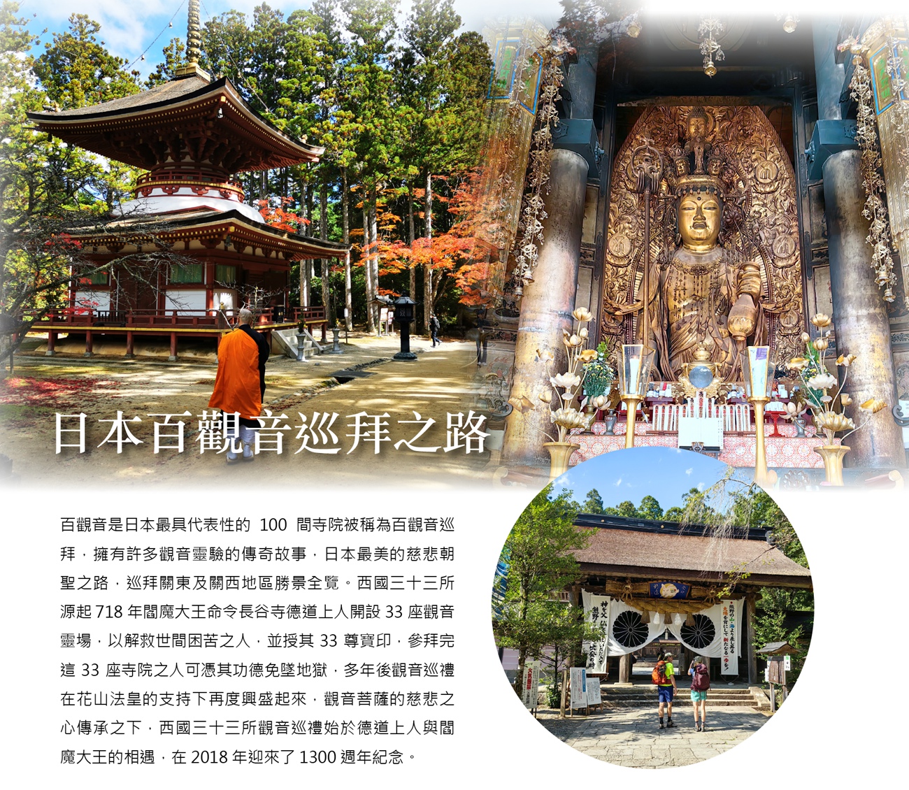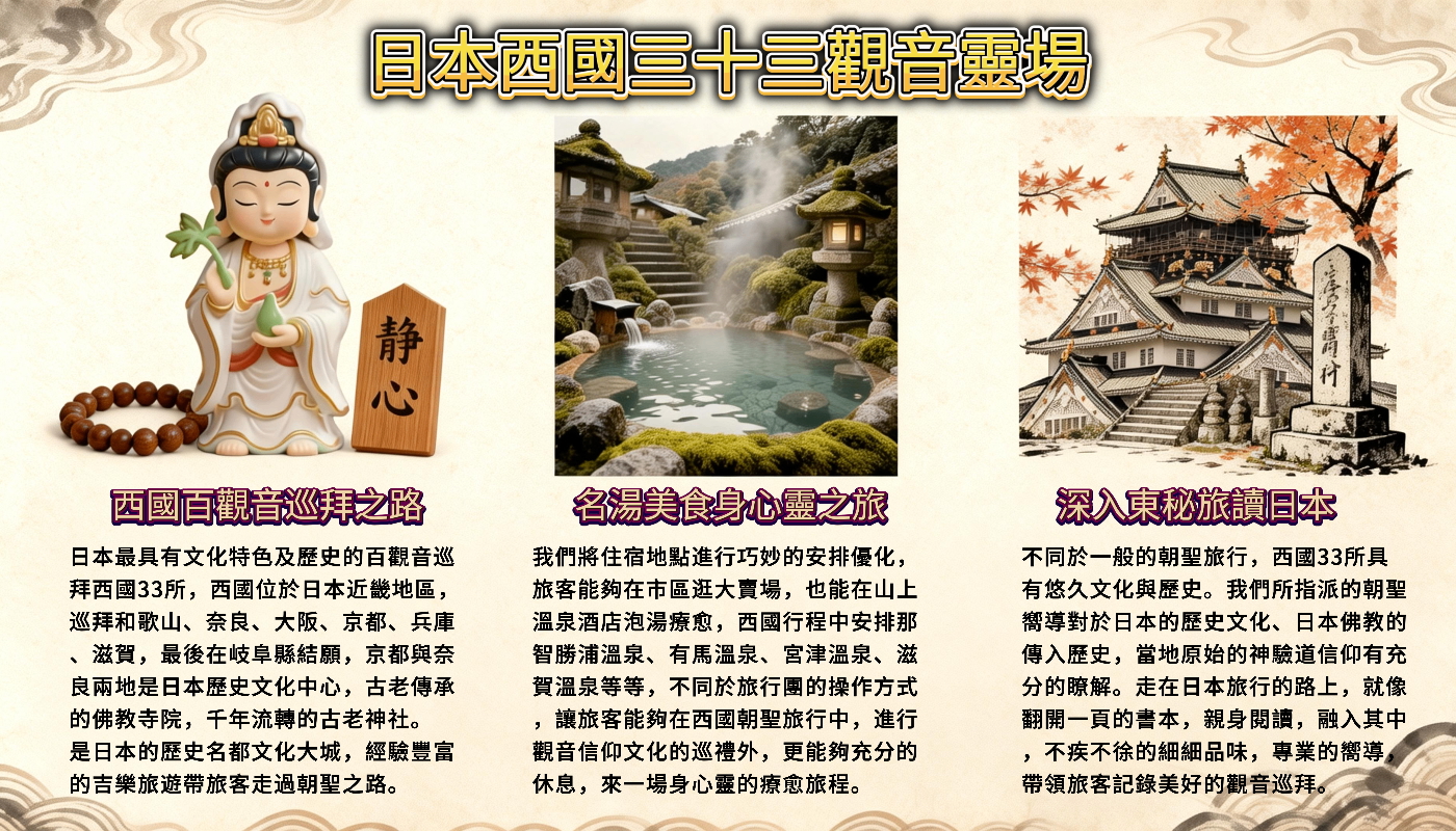 酒店早餐後,前往朝禮日本西國觀音靈場,今日區域為日本和歌山寺院,特別安排參觀熊野古道,神道信仰、自然崇拜的日本人,一生至少要朝拜的兩大神聖之地,就是伊勢神宮和熊野古道。其中熊野古道在2004年被評選為世界遺産(修行道路)。2004年,「紀伊山地的靈場和參拜道」被登錄為世界文化遺產時,熊野古道是其重要組成部分。這條古道歷史悠久,逾千年來吸引了日本各個階層的人們前來朝聖,尋求心靈啟發與現世來世的安寧。