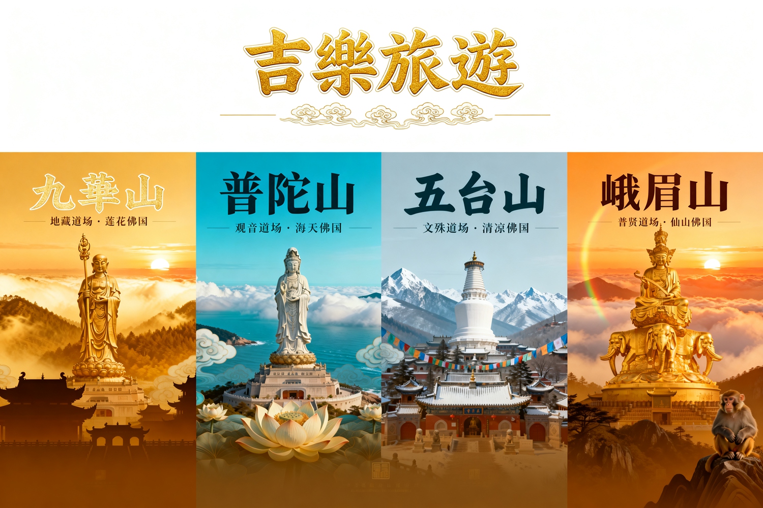 1、 吉樂朝聖旅遊,朝禮中國四大名山,峨嵋山、普陀山、五台山、九華山,禮佛朝聖深度體驗。