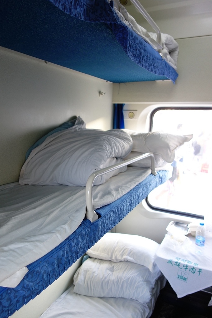 硬臥,上中下有三張床疊在一起,上下空間比較狹小,但是睡一個晚上是沒有問題的,硬臥是沒有拉門的,晚上走來走去會被人看見,台灣人基本上一定要睡軟臥,但是軟臥有時候一節車廂48個位置,要開放給全大陸+台灣買,有時候團體人數較多旅行社沒有辦法百分之百買到,旅行社就會推說青藏鐵道會被軍方徵收,說真的被軍方徵收確實有的,但也沒有天天徵收啊! 機率不高的,最主要大陸火車票開放網路訂票,旅行社不一定拿的到這麼多票,有時候要跟黃牛買,畢竟數量不多。
