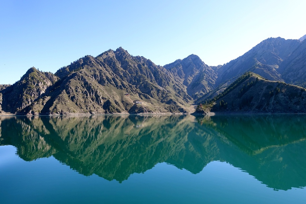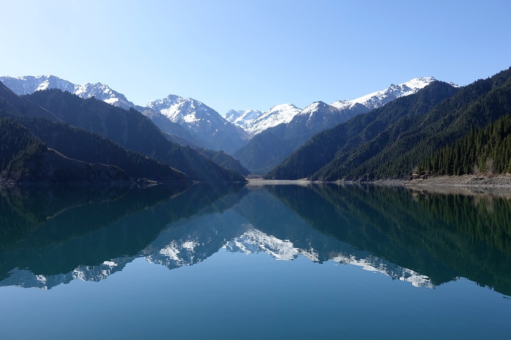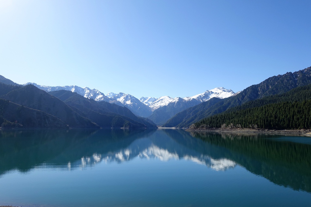 從天山天池景區入口上山,最快也要早上十點多,才能抵達天池池畔,這已經是超光速了,我們是最早抵達天池的遊客,連船老大都還沒上班呢,天池水面相當平靜。