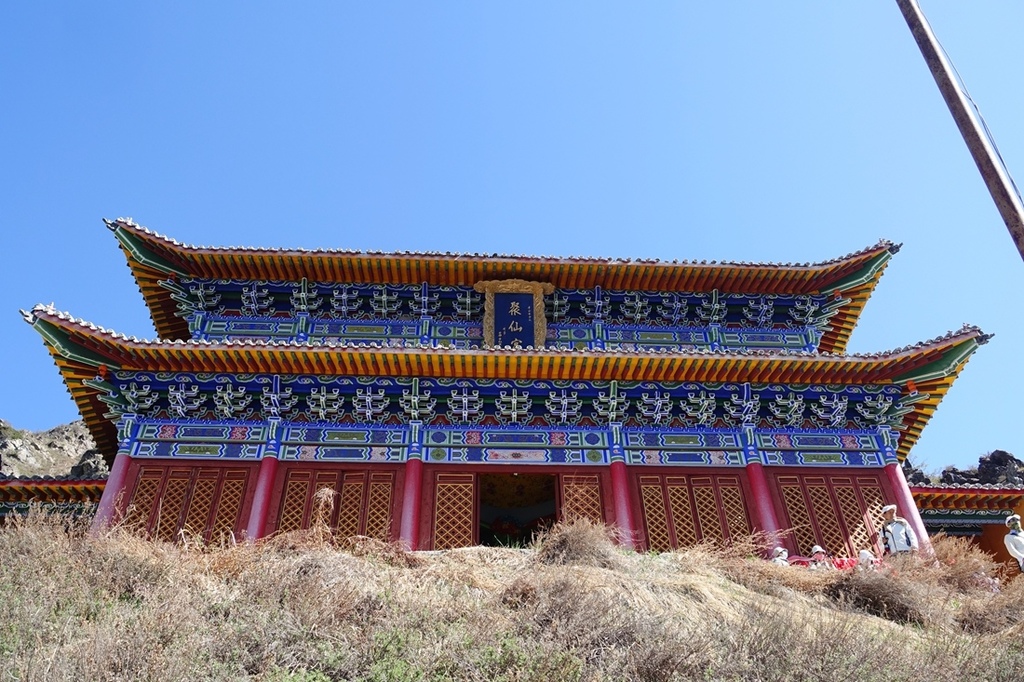 遠眺天池東岸,西王母廟,始建於元朝,已經修建及破壞,目前看到的是1999年在原廟址上重建的建築,裡面供奉著王母娘娘,所以也稱“娘娘廟”。