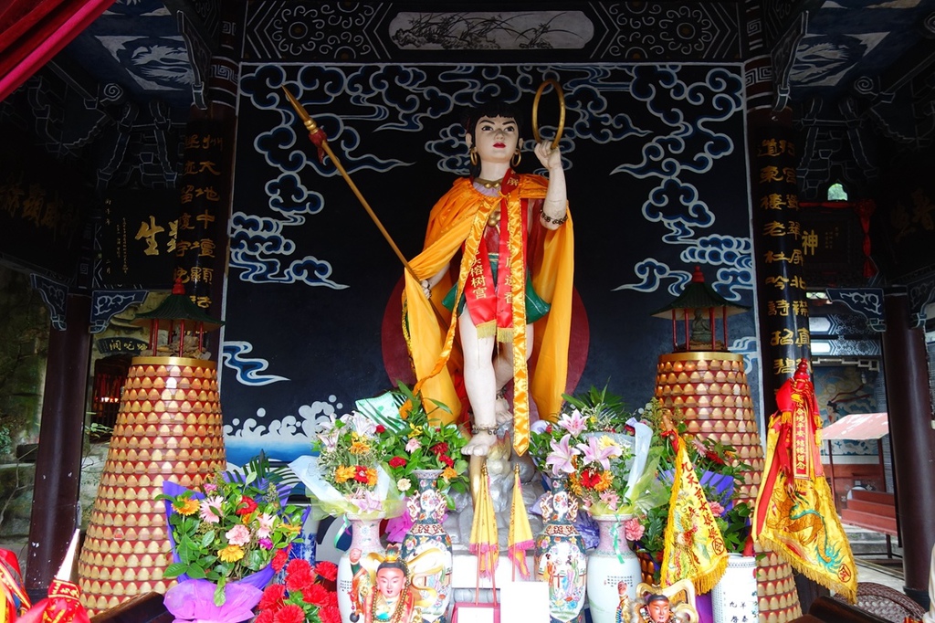 這座就是聲名遠播海外的三太子祖廟,桌上有許多神明與供品,與台灣的頗為類似。