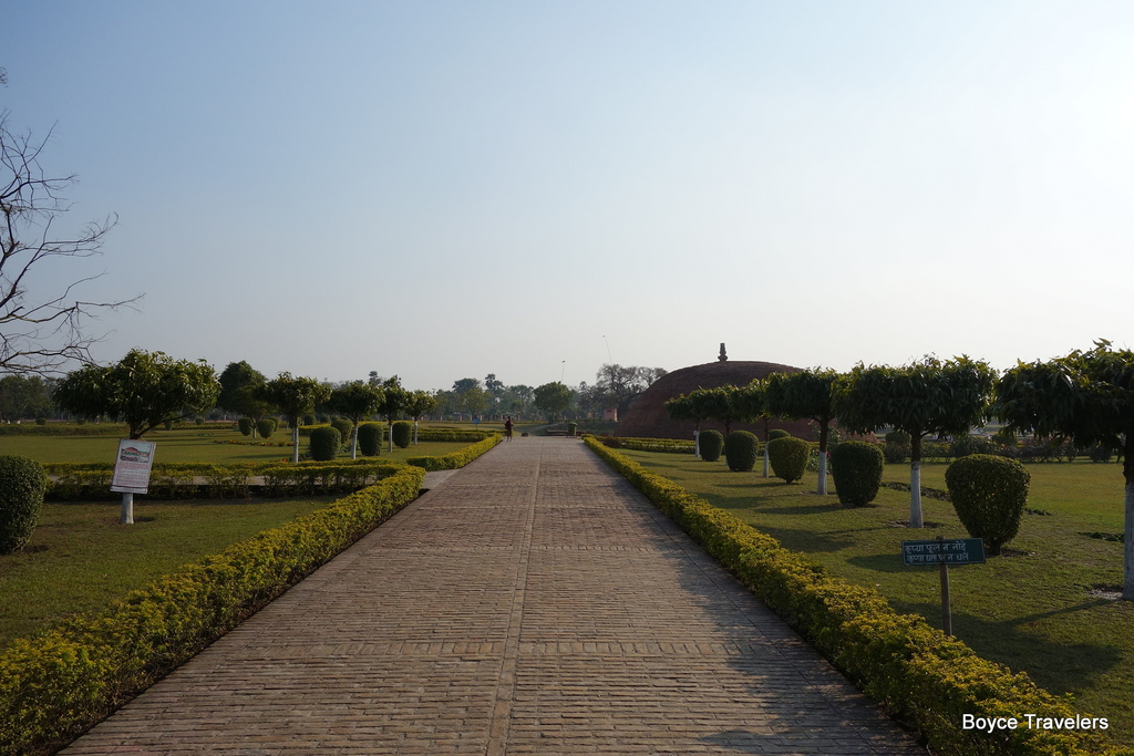 朝著佛陀舍利塔走過去,會經過一處草坪,前方是佛陀舍利塔,兩千多年前佛陀於拘尸那羅滅度後,印度各國將佛陀舍利分成了八分,八王分舍利,其中一份就是我們即將前往的舍利塔,這份佛陀舍利是由離車族,也就是吠舍離國所得到。