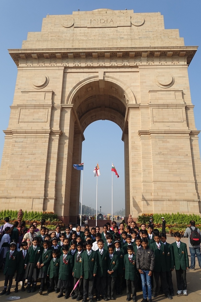 印度小學生校外教學也到印度門,由老師帶領著,穿上整齊劃一的制服出遊,稚氣中帶一點點的可愛,在某部分來說印度小孩滿熱情可愛的,看你在旁邊看還會跟你揮揮手。