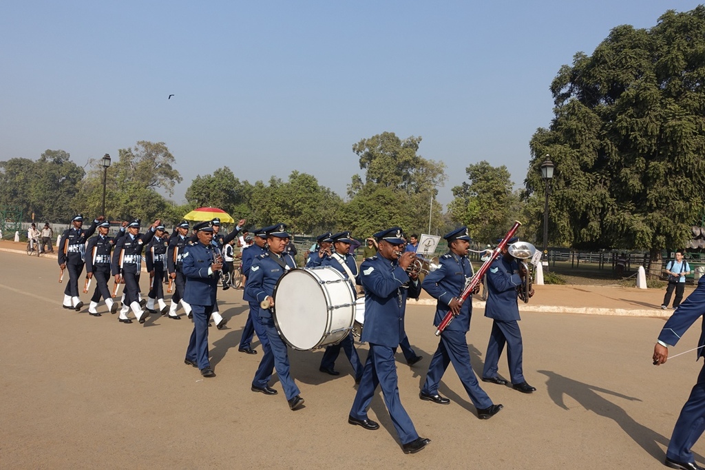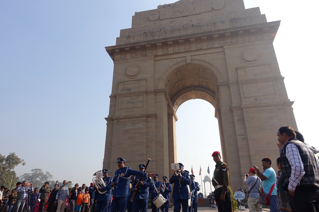 突然間士兵從旁出現,吹喇叭打鼓一路搖擺前進,整齊劃一的隊形朝著印度門前進。