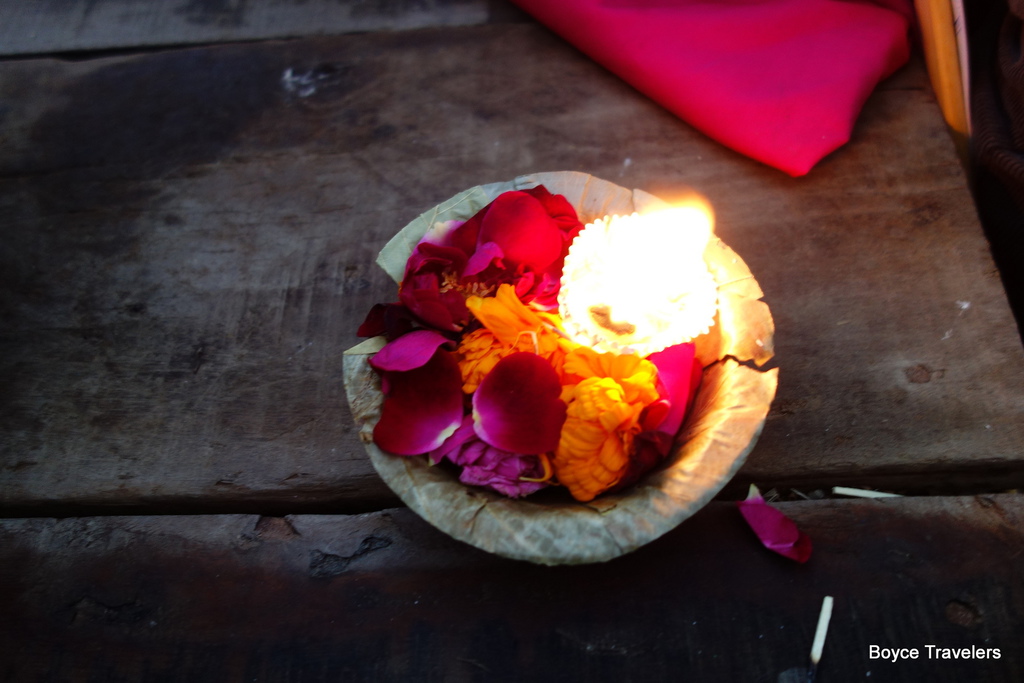小販會拿著「花品+蠟燭」販售在船上販售,這就是用來祈福的水燈,一組鮮花蠟燭10元盧比,每個人可以購買一個,所以身上要準備好10元盧比的零錢,船上要小販找零錢是很困難的。