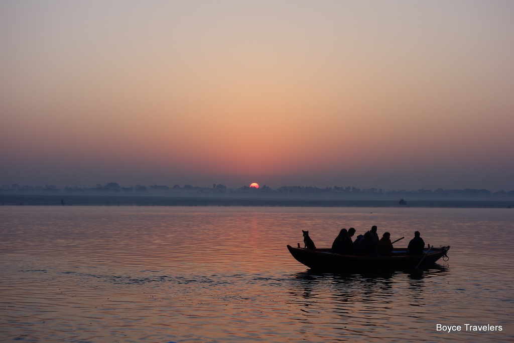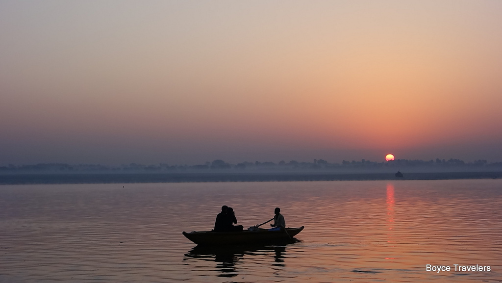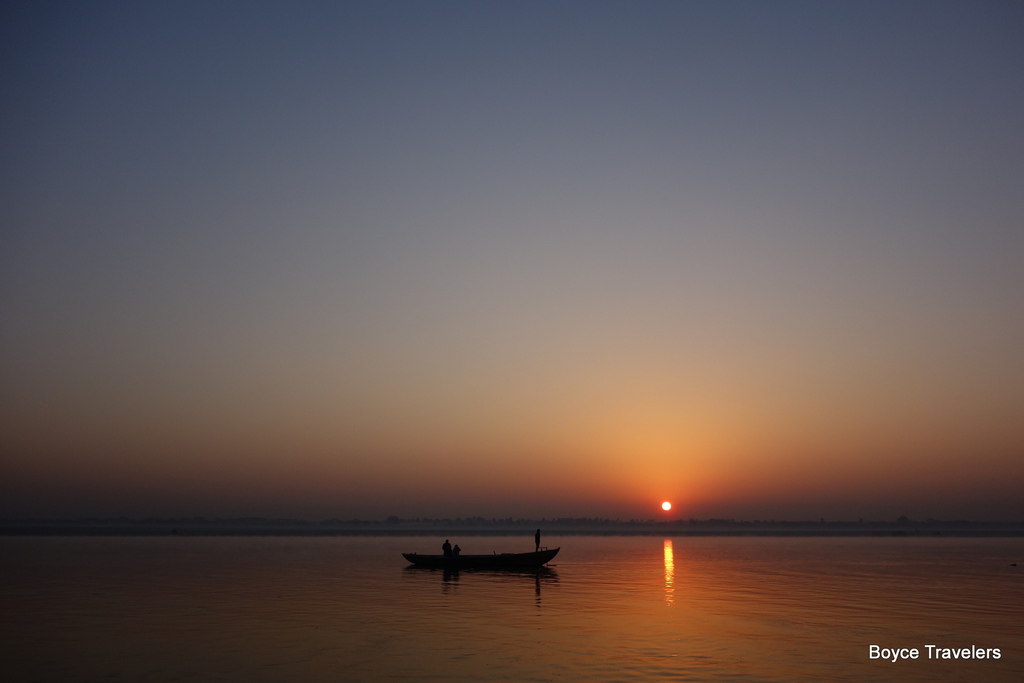 太陽日出時刻,小船停駐在恆河水面上。