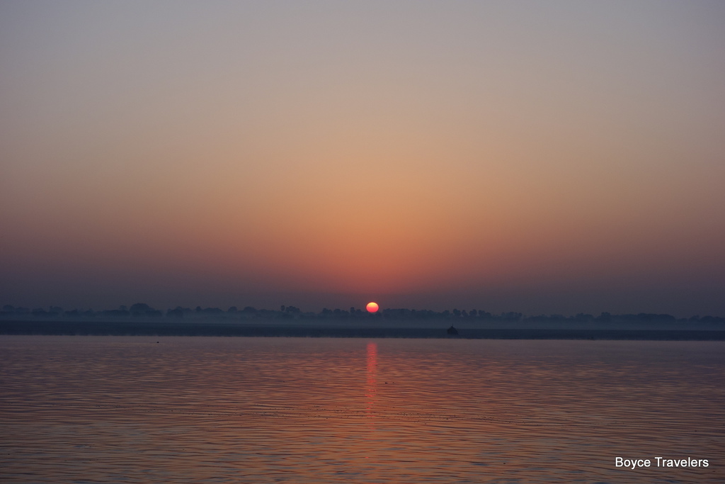 突然之間太陽從遠方的塵霧串出,瞬間照亮了天空,恆河日出的美麗難以用言語形容,我的心情也充滿著驚豔,即使來了很多次印度,每次看到恆河日出依然驚艷不已。
