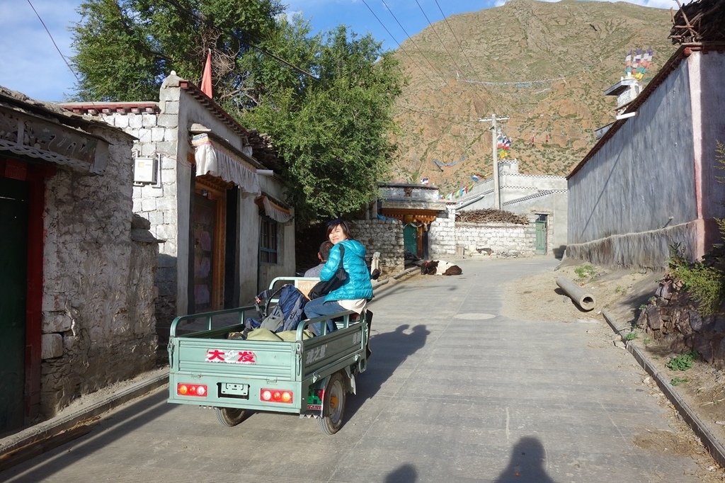 我們和藏民詢問貢布日神山在哪,藏民說他知道可以帶我們去,於是我們就一起上了電動車,沒想到體重過重,電動車爬山實在上不去啊!只好下來用走路的。
