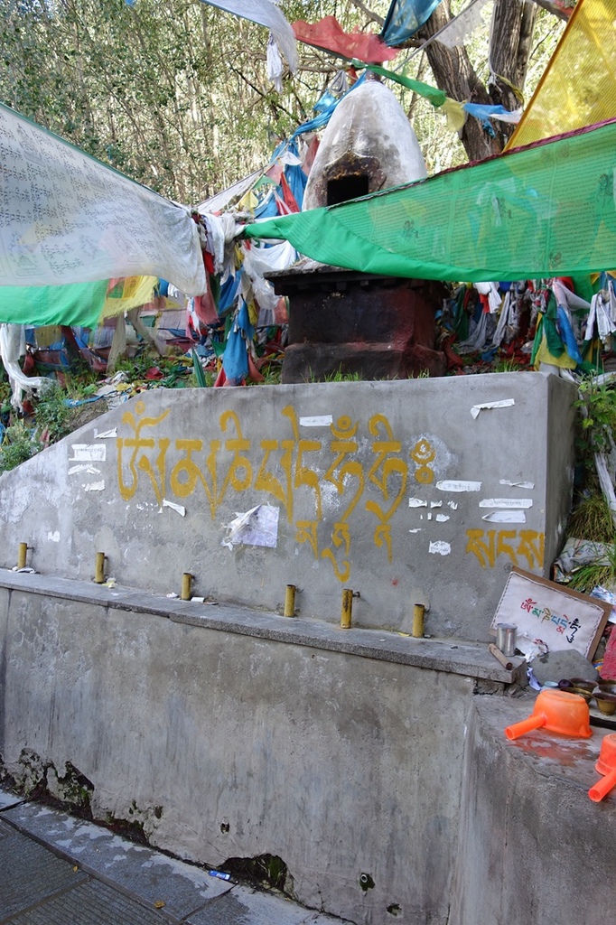 走上山沒多久,就遇到一群藏民,他們在一處有供奉神靈的小廟旁裝水飲用,很明顯這是布日神山的山腰自然流出的山泉,我可以稱他為貢布日神泉嗎?