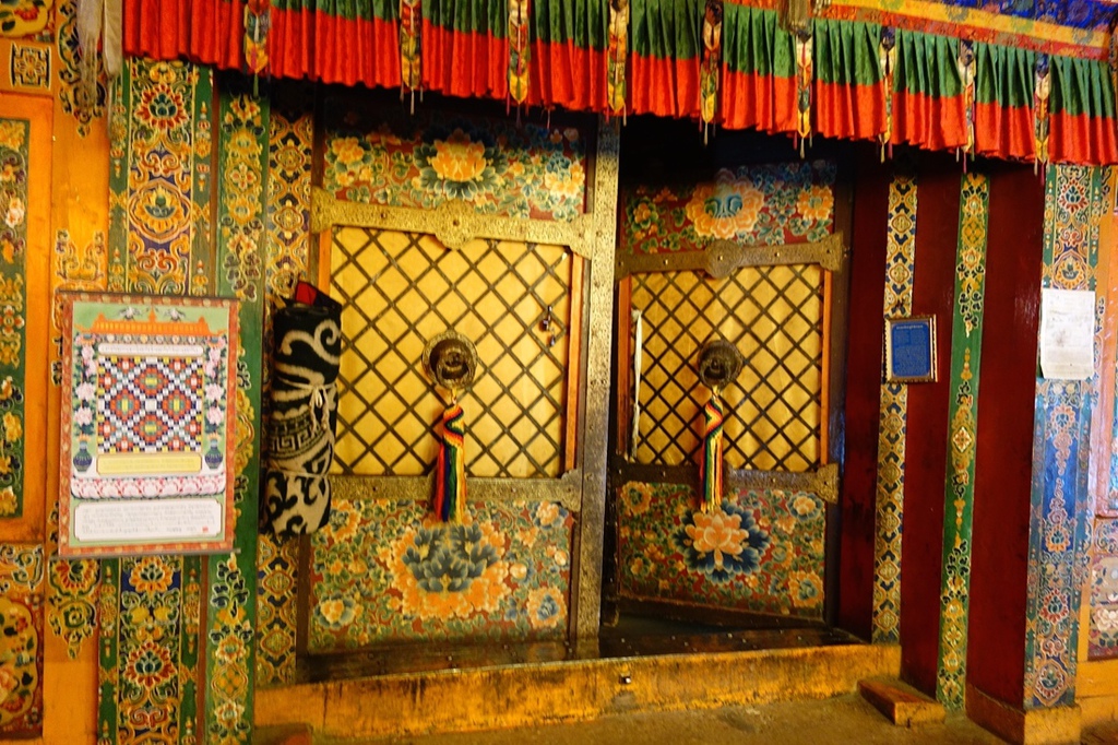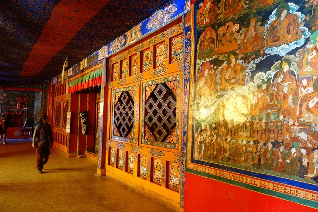 二樓區域,有ㄧ間展覽室,陳列著蓮花生大士使用過的手杖。我慢慢的在桑耶寺打轉參觀,在大殿外有許多精美的壁畫,大殿內則是有許多年代悠久的佛像及壇城,大殿內散發濃濃的酥油味道,這也是西藏佛教寺院的特色。