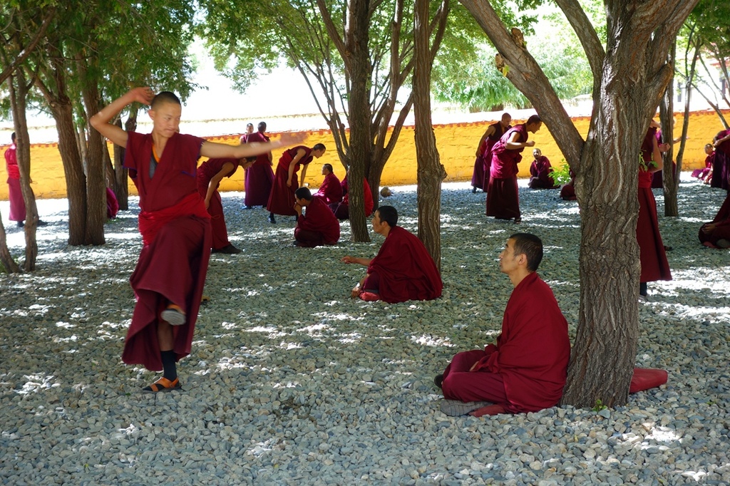 進入佛學院見到許多僧人,這些僧人也沒什麼搭理我們,僧人正在認真的辯經,什麼是辯經呢? 辯經,藏語音譯為「村尼作巴」,是藏傳佛教中的一種辯論,常見於藏傳佛教寺廟內的樹蔭處。