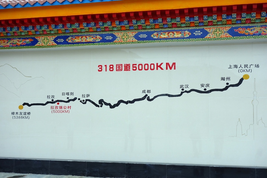 從日喀則出發,抵達G318國道5000KM公里處,這裡位於拉孜強公村,G318國道從上海人民廣場出發,一路經過武漢、成都、拉薩等地,最終點站位於西藏尼泊爾邊界的樟木口岸,開車也可以從西藏直接前往上海。我們今天的目的地是前往珠峰大本營住宿一晚。