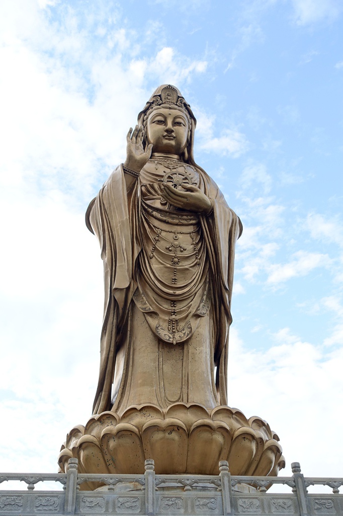 南海觀音像立像台座三層,總高33米,其中佛像18米,蓮台2米,台基13米,台基面積為5500平方米。佛像頂現彌陀,左手託法輪,右手施無畏印,妙狀、慈祥,體現了觀世音菩薩“慧眼視眾生,弘誓深如海之法身”。