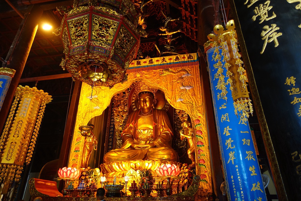 觀音殿內,殿高22米,重簷歇山,黃琉璃頂,斗拱承托。殿內八根金柱的柱礎是精緻的雕龍磚。藻井是按古樸典雅的九龍戲珠圖案雕刻的,一條龍盤頂,八條龍環八根垂柱昂首飛舞而下,正中懸吊一盞琉璃燈,宛若一顆明珠,組成九龍戲珠的立體圖案。正中供奉毗廬觀音像。